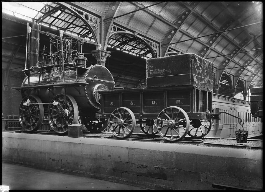 The S&DR’s Locomotion No.1 displayed as a historical artifact at Darlington railway station in the early 20th century. © Historic England Archive. Image reference BB057004.